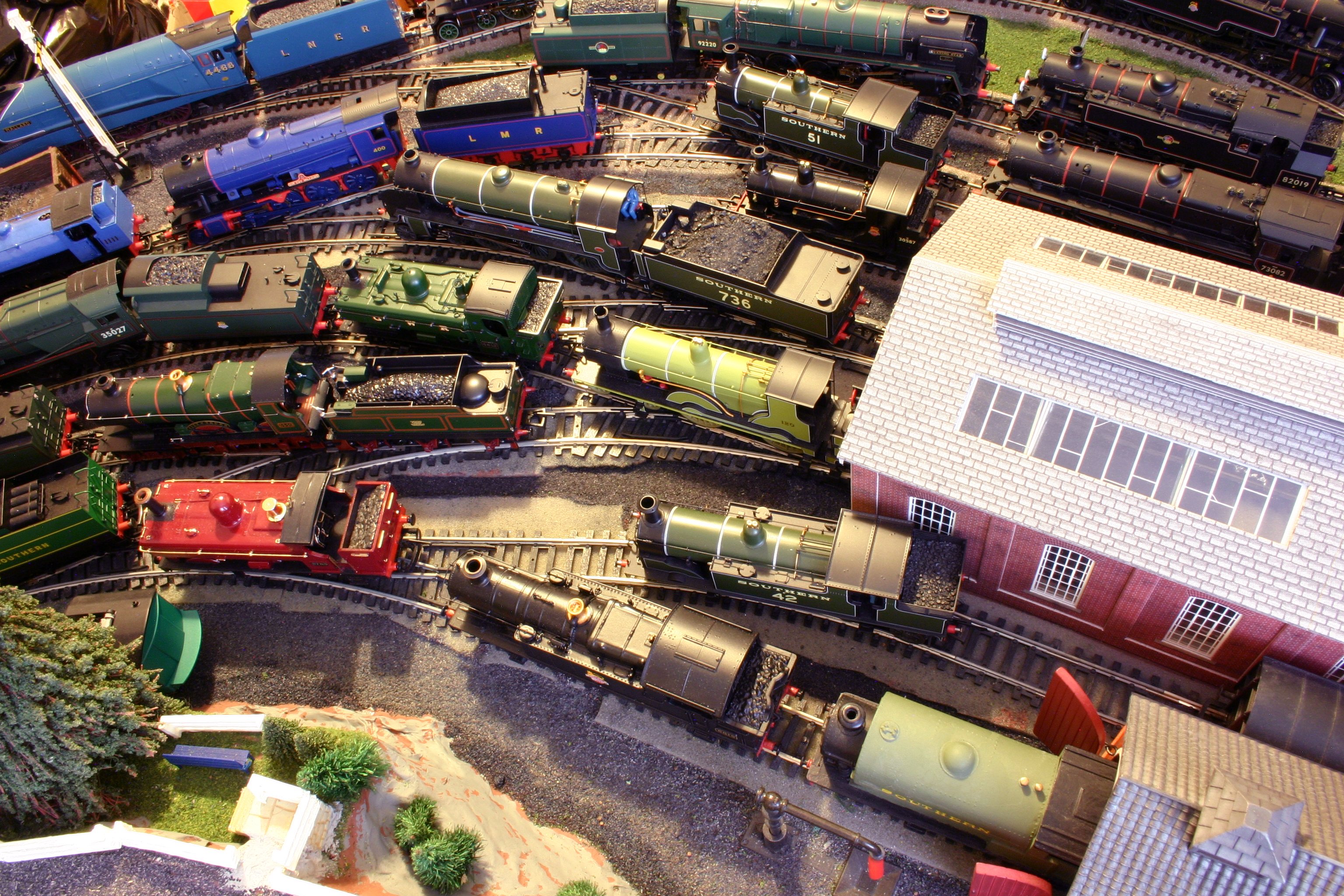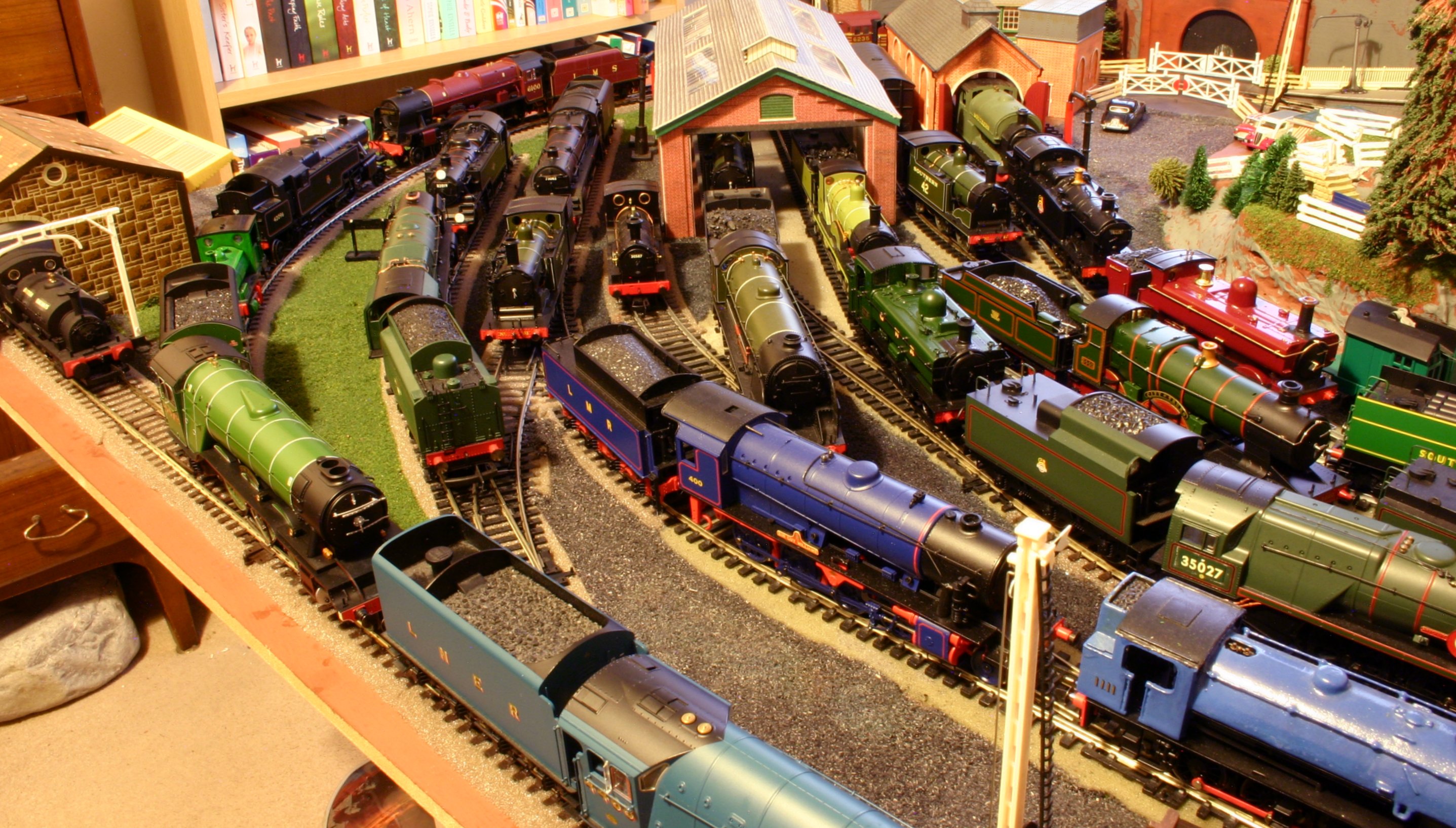 Arguably the biggest railway event in the UK is currently in full swing in York. Railfest is the coming together of many locomotives from the National Collection, preserved lines and the mainline. Seeing as I was unable to attend and also for a little fun, I decided to run my very own Locoyardfest! The challenge was to put all my locomotives on the layout at the same time… and this is the result. 36 locomotives make the line-up, grouped where possible in logical (ish) groups.