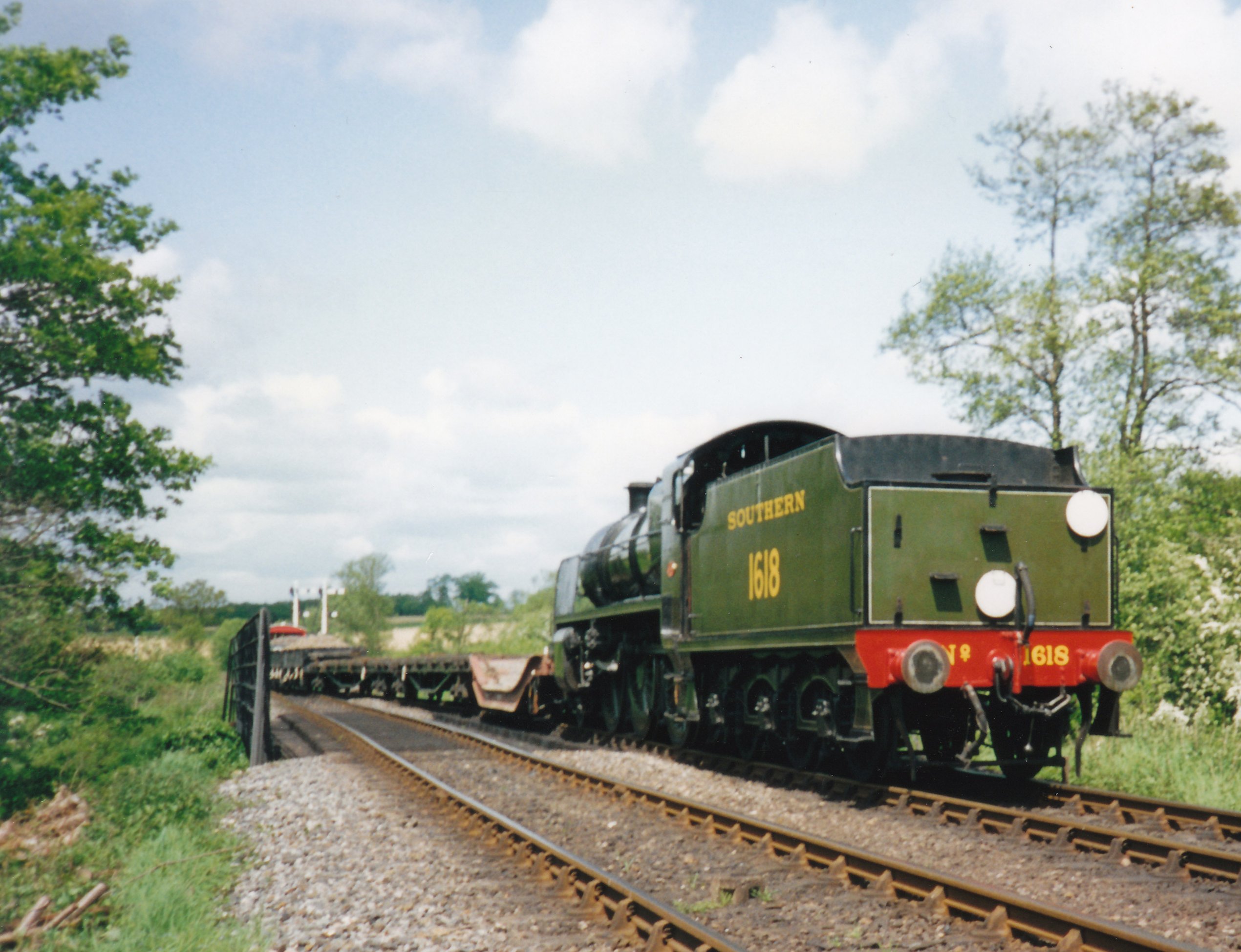 The top picture of this post shows North London Railway tank engine tank 58850, running past Southern Railway Maunsell Q class 541 in the early 1990’s. Both are unique survivors that are no longer in action, although the overhaul of the Q class is in progress. The picture below shows U class 1618 with a goods train. This U class is awaiting overhaul, but you’ll find its classmate in regular service now (1638.)