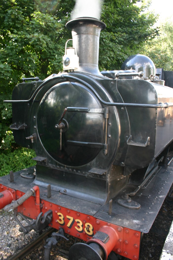 During last week’s visit to Didcot Railway Centre, British Standard 7MT 70000 Britannia was not the only locomotive in steam. On another demonstration line, pulling an auto-coach was GWR black liveried 8750 class pannier tank 3738. This locomotive was operated from “Didcot Halt”, a faithful recreation of a GWR branchline.