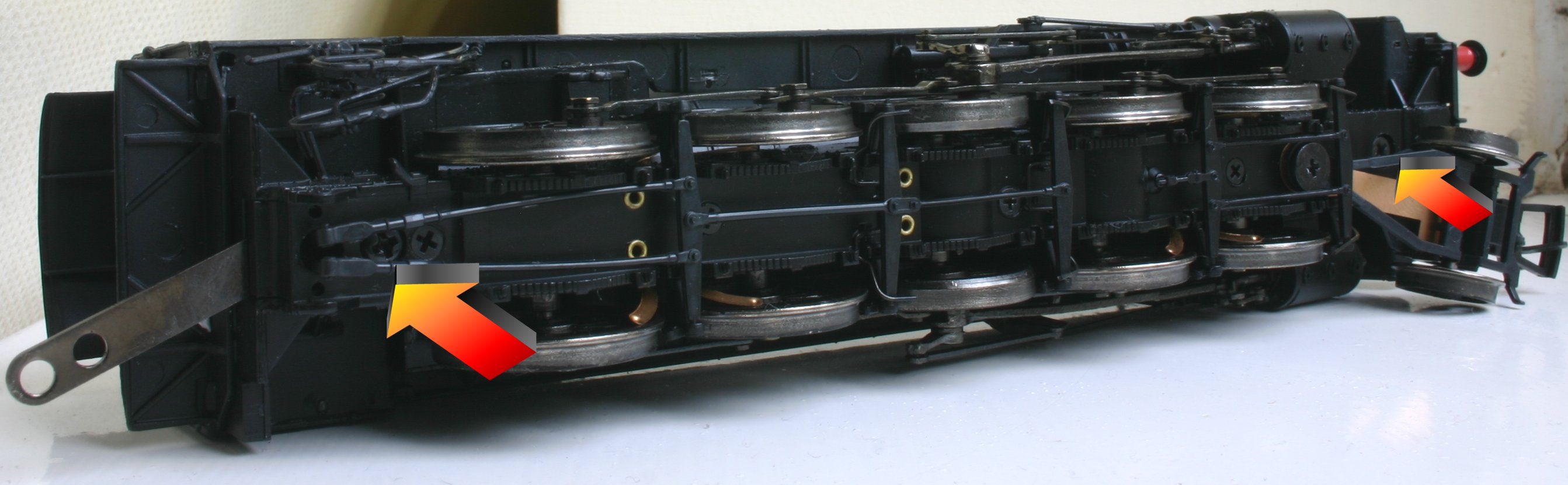 Bachmann’s model is DCC ready, with the DCC socket located on the motor, found in the smokebox. To access it you will need to separate the body from the chassis. To do this, remove the first screw located at the front of the model (found under the front bogey) and the last screw (the larger of the two) located under the cab as shown above.