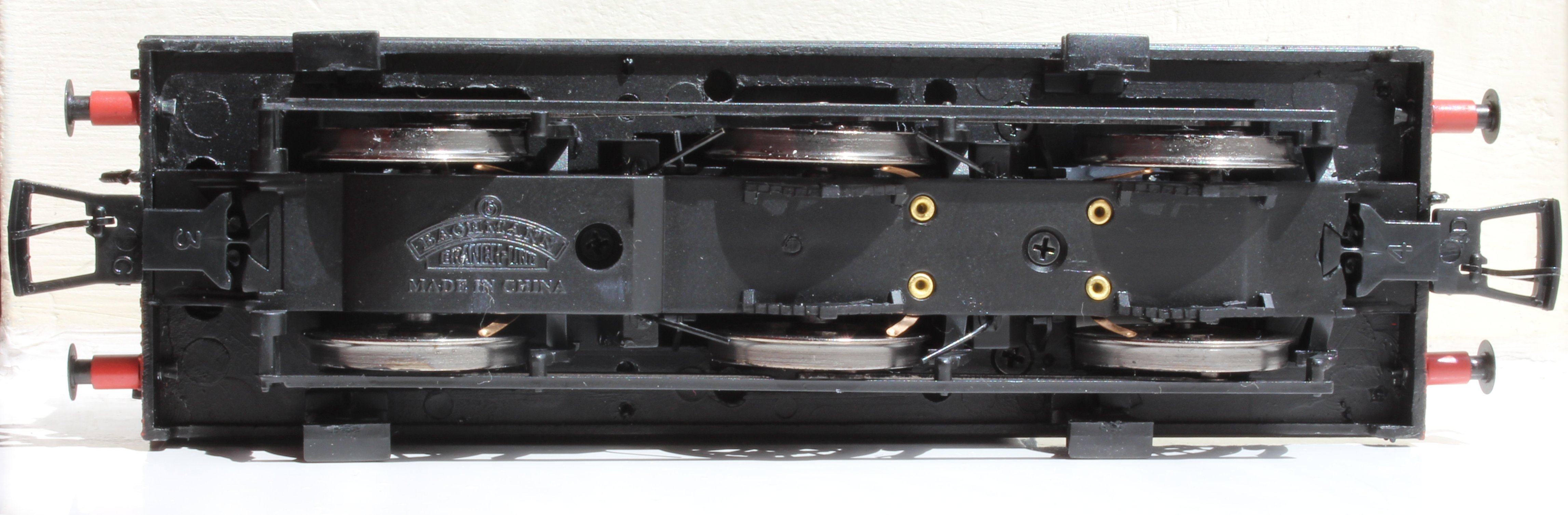 This model is a DCC Ready version of the Bachmann Jinty. Many earlier versions of the model are not DCC Ready and require hard-wiring for digital operation, although some were DCC Fitted. To fit a DCC decoder you will need a small to medium sized 8-pin decoder with a wiring harness. As always, check the model works well in DC mode before starting the conversion. The first step is to remove the NEM tension-lock couplings from their pockets.