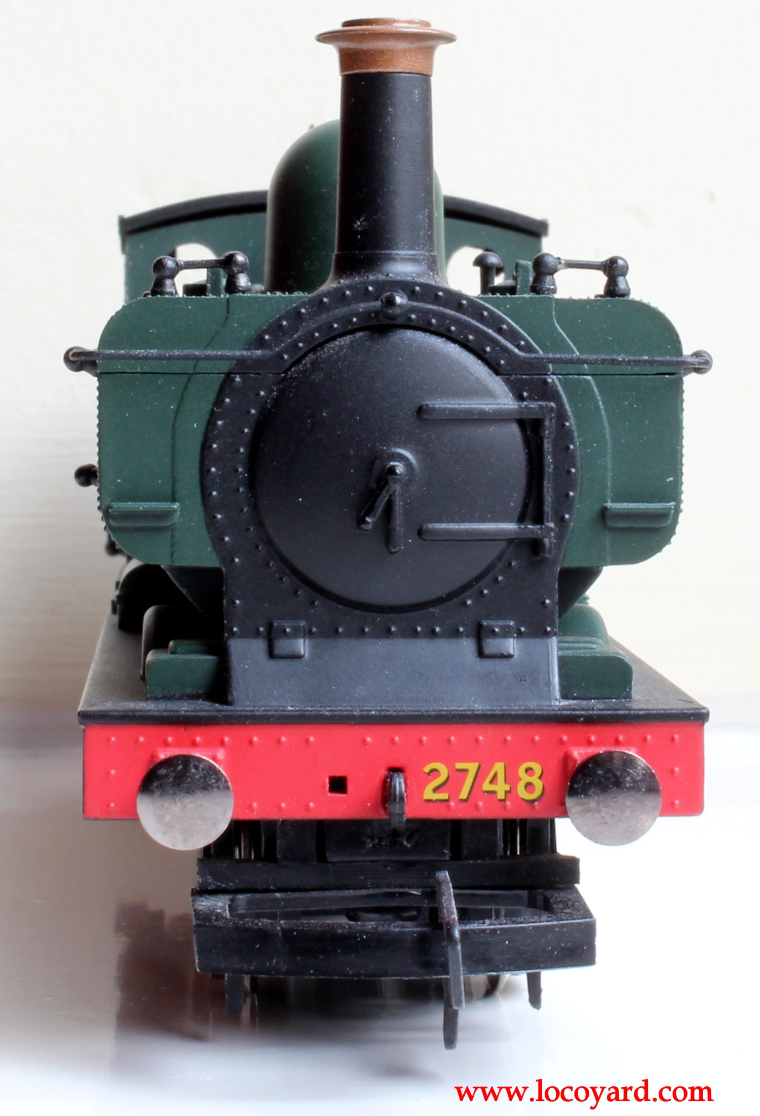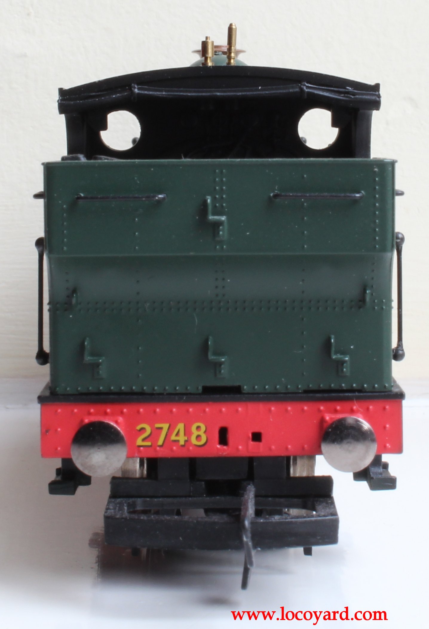 Although this model is in it’s thirties, it has benefited from a recent (ish) makeover, that added several handrails to the old model, significantly improving it. Compare the picture above with the Locoyard modified Christmas pannier tank below – the newer version above has much better handrails. The model has a half cab with a half-decent moulded cab backhead (although the details are not picked out) and some nice moulded rivets. The chimney has a nice brass top to it, the plastic brass-painted safety valve is much improved over the older version and is ok. Unlike other elderly Hornby models, it has been given a cosmetic coupling hook that isn’t a lump of plastic and the buffers, although not sprung, look pretty good. The chassis is the standard Hornby type 7 set-up and looks fairly poor, plus it lacks detail under the boiler. It has no lamp irons on the front or other refinements, but it has a slight edge over the other budget Hornby 0-6-0 models.