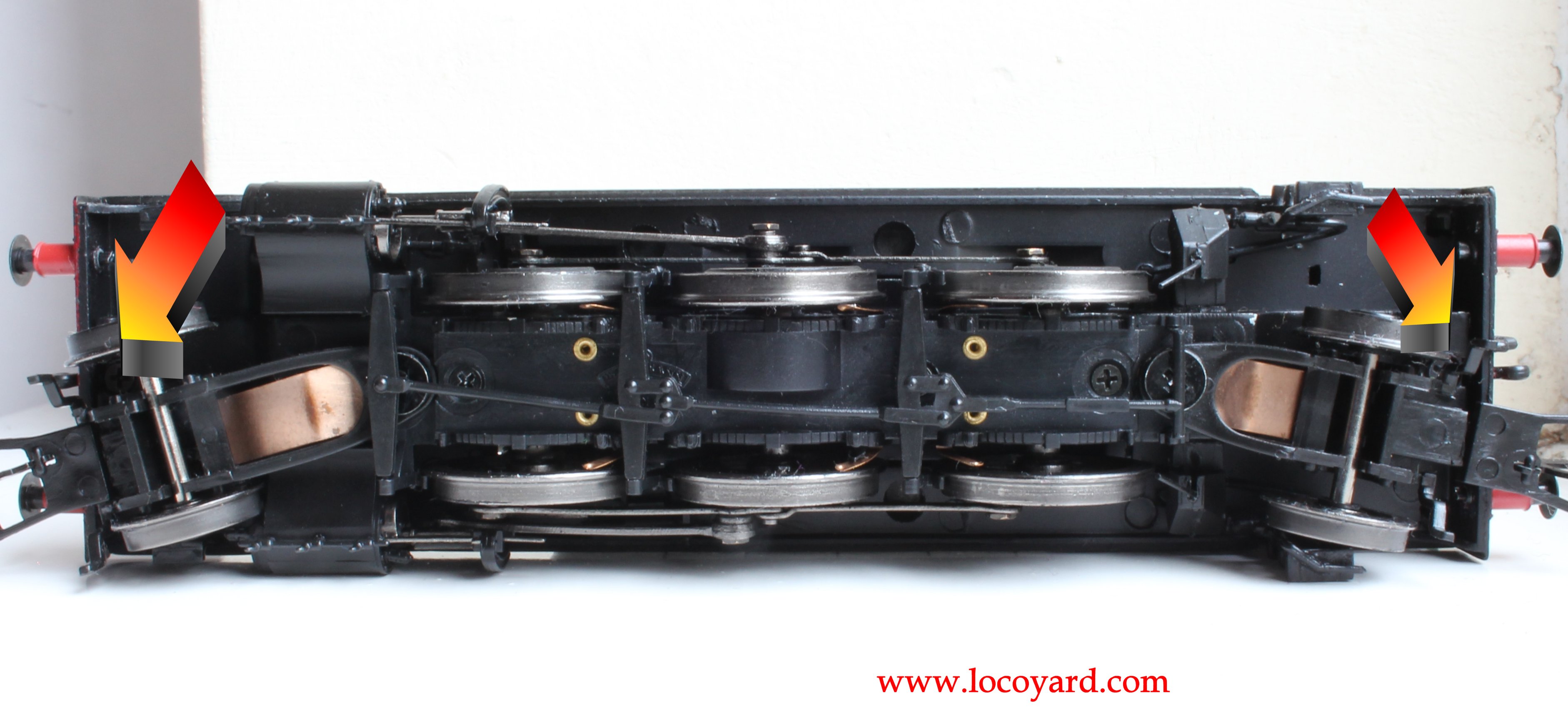 The first step is to unscrew the two screws underneath each bogey as indicated above and gently separate the body from the chassis, taking care not to damage anything.