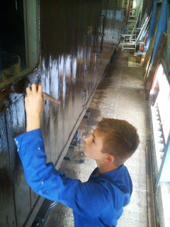 I began in the cold month of February painting, although undercover, only in the barn (the outer building of the C+W works) so no heating. But no matter, I was volunteering on a railway! Through the weeks I turned up almost every morning up until lunchtime painting my first wagon, a vehicle codenamed by the gwr MONSTER, take a guess why! During the next few weeks and months, I worked my way through the lower parts of what I refer to as the painting ranks. These go as follows in my mind; undercoat freight, topcoat freight, lettering freight, bottom coat coaches, undercoat coaches, topcoat coaches, lining out, and finally varnish. After a couple of months at this, and finally being given the honour of painting the lettering on a GW toad van, Dave promoted me to coach painting. Here I really learnt how to paint, there is a certain skill involved with the final flick of the brush barely touching the paint. Some railways spray their coaches, but everyone here agrees that brush painting gives a much nicer finish, and is a little more personal.