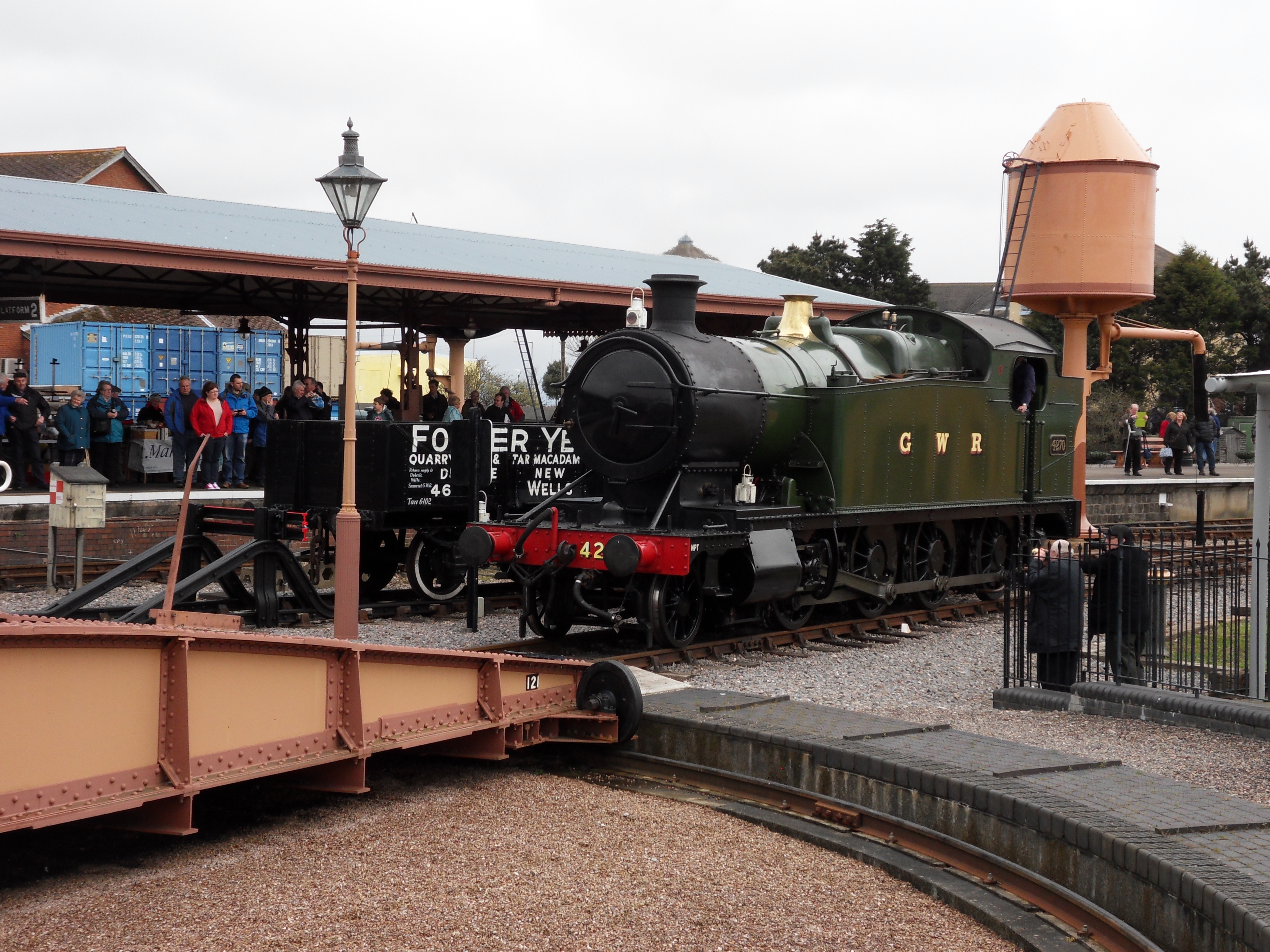 We spent an hour or so at Minehead, the railway’s seaside terminus, during the gala, although there was so much to do we never got to see the sea. The most important thing first of all of course was to find lunch, a perusal of the menu in the turntable cafe suggested a breakfast bap would be a good idea, and this was consumed whilst watching 4270 getting dizzy on the turntable.